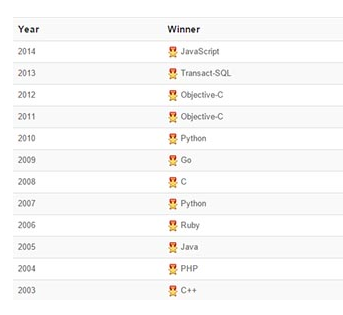 不過,JavaScript近幾年來已逐漸成為標準的瀏覽器腳本語言,而JavaScript函式庫以及目前最受歡迎的JavaScript函式庫JQuery、事件驅動I/O伺服端JavaScript環境的Node.js、前端使用JavaScript的GWT等程式語言的成功,讓JavaScript摘下冠軍頭銜更顯得實至名歸。