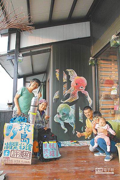靠以畫換宿、換食徒步環島的壁畫藝術家許漢柏和女友何翠紅,正展開他們愛的第2哩路,17日2人行腳到嘉義縣民雄鄉偏僻村落1間咖啡廳,在愛魚老闆翁哲偉免費提供食宿下,2人合力彩繪2尾躍出牆面的3D立體金魚,回報愛魚人的熱情接待。