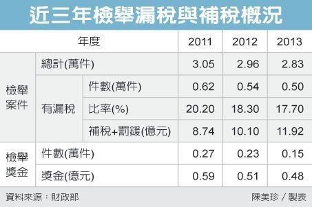 即使稅捐機關處理檢舉漏稅案有一定的流程,但多數的檢舉案都會讓稅捐機關白忙一場。根據統計,自2011到2013年度的三年內,平均每年受理的檢舉案件是2.9萬件,查不到漏稅事實結案者就有2.3萬件,比重高達80%以上。
