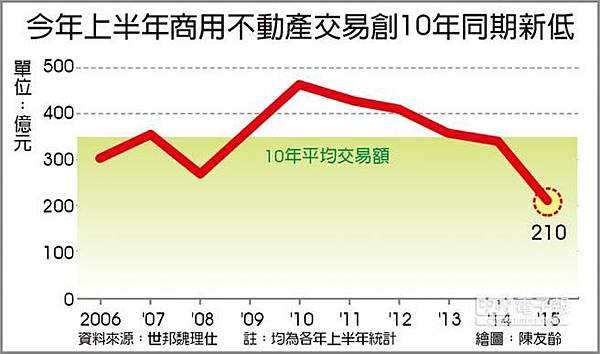 世邦魏理仕台灣分公司董事總經理林俊銘表示,受到總統大選年、房地合一稅影響,第2季商用不動產市場交易量僅353億元,較上季傳統淡季量縮10%,和2014年同期相比,交易量更攔腰砍半,驟降48%。展望2015年全年交易量,恐將低於600億元(不含土地交易),創下金融海嘯以來新低。
