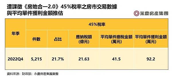 根據財政部《房地合一2.0》稅收數據顯示,在2022年第四季,遭到課徵45%高稅率的房市短期交易案件占比高達21.7%;根據當季應納稅額數字進行推估,平均單件房市短期交易獲利金額高達92.2萬。