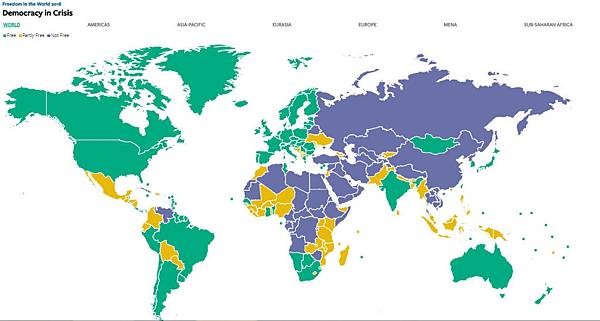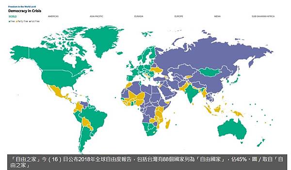 「自由之家」今(16)日公布2018年全球自由度報告,包括台灣有88個國家列為「自由國家」,佔45%。圖/取自「自由之家」