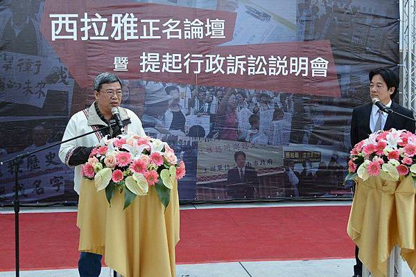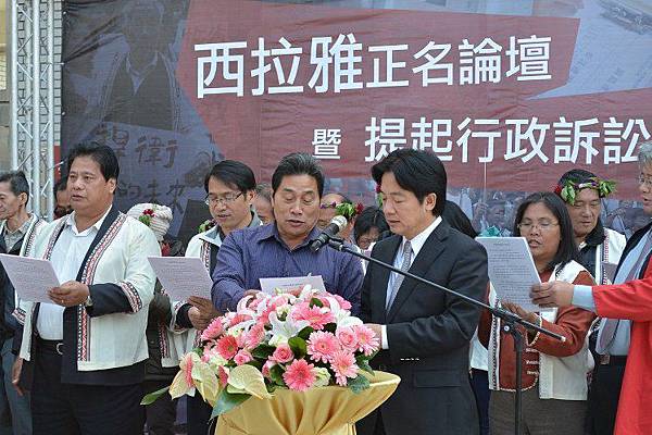 台南市長賴清德今(31)日出席「西拉雅正名論壇暨提起行政訴訟說明會」與西拉雅族親共同發表正名宣言,宣誓推動正名運動的決心,並定位2015年為西拉雅正名關鍵年,下周將向台北高等行政法院提起行政訴訟。