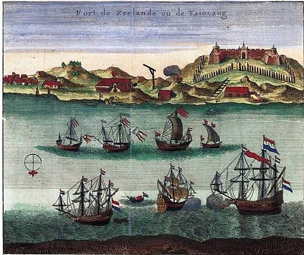(1644年的熱蘭遮城。原收錄於Isaac Commelin約在1644年編著的《荷蘭聯合東印度公司的起源與發展》一書中,此張為法國人René Augustin de Renneville在1725年所出版之法文本,原圖為黑白,這張則繪上色彩,分外美麗。圖中是描述台南(熱蘭遮)城初建之時的景象(約1630年),城建在臺南安平的沙丘上,外面用木柵圍住,旁邊的房子,分別為公司商館、倉庫。最左邊則為漢人生意人的住宅與店鋪。前方則為舊安平港口,前排船桅懸掛紅白藍三色旗者,是荷蘭船隻。圖片取自/Wikipedia Commons)
