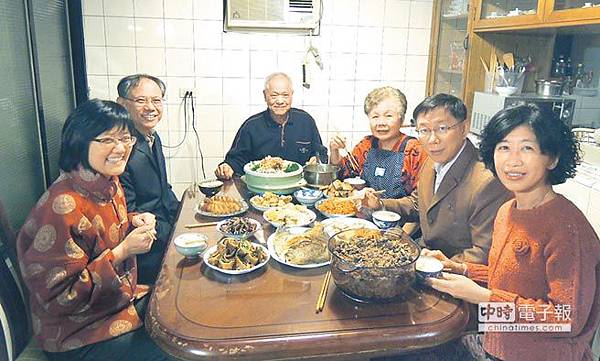 台北市長柯文哲夫婦(右起)18日除夕夜回到新竹老家與父母、弟弟、妹妹一起吃年夜飯。(林駿剛攝)
