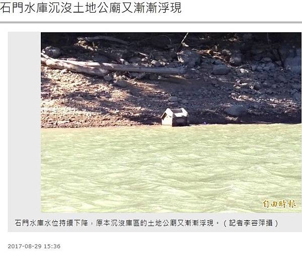 水利署北區水資源局副局長邱忠川表示,庫區被蓄水淹沒的土地公廟是石門水庫水情指標之一,只要水位在240公尺以上,土地公廟將會沉入在水中,但水位下降240公尺以下,土地公廟就會漸漸露出,以現在水位,土地公廟慢慢浮出。