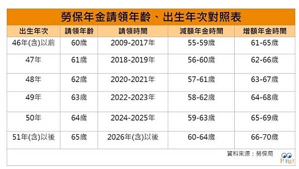 儘管如此,目前仍有許多人誤以為一律60歲就可請領老年年金,其實換算成自己的出生年次來對照法定請領年齡更易懂,民國46年次(西元1957年)以前出生的勞工年滿60歲即可請領;民國47年次(西元1958年)出生法定請領年齡為61歲;依此類推,48年次(西元1959年)為62歲、49年次(西元1960年)為63歲、50年次(西元1961年)為64歲,最後是51年次(西元1962年)以後出生的勞工法定請領年齡都是65歲。
