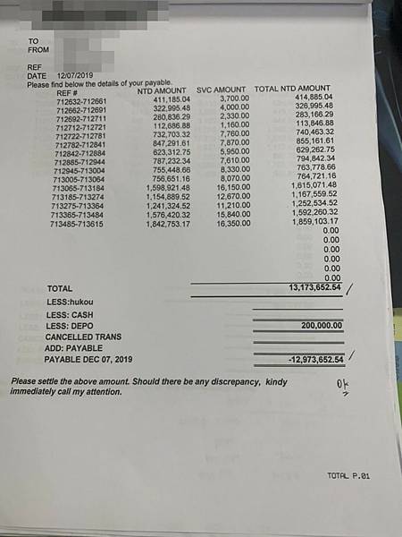 台中檢調一○五年底進行搜索,查出三年多來,該集團匯兌金額達台幣五六六億五九六二萬餘元,收取的手續費(不法利益)達七億一四五萬餘元,但現場僅查扣五百萬餘元現金。依刑法沒收新制,不法所得七億餘元應宣告沒收,不足額部分,日後可對兩公司及三名被告進行追繳或追徵。