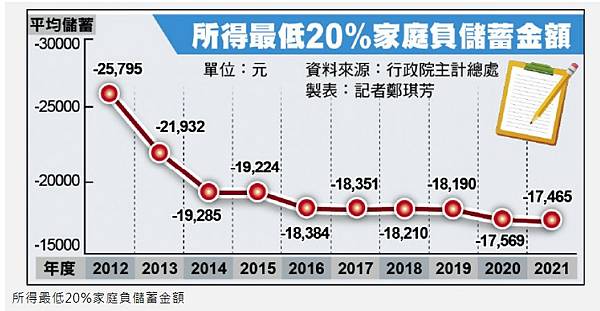 主計總處報告指出,二○二一年家庭可支配所得平均一○九萬五五四元、年增一.○一%;其中,所得最低二十%家庭,平均三十五萬八五九四元、年增一.○二%,消費支出三十七萬六○五八元、年增○.九五%,負儲蓄一萬七四六五元、年減一○四元。