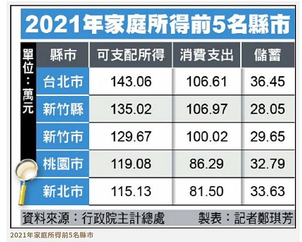 不過,新竹縣市家庭所得名列前茅,家庭儲蓄卻未擠進前三名,主因新竹縣市家庭平均消費支出達一○六.九七萬及一○○.○二萬元,與北市一○六.六一萬元相當,但遠高於新北及桃園的八十多萬元。