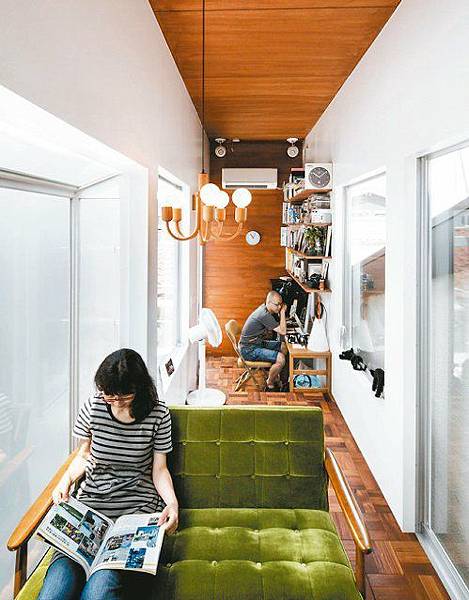 建築物中間的空隙是用來採光和讓空氣流進屋內,也能用來晾衣服,屋主也可以坐在椅上呼吸新鮮空氣。不過,這個空隙不能加蓋,就算是玻璃屋頂也不行,因為日本建築法規要求,要有40%的戶外空間。