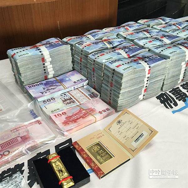 詐欺集團施姓女主嫌專騙大陸人,牟取暴利,除1500萬還有各國紙幣及昂貴黃金10兩。(黃進恭攝)