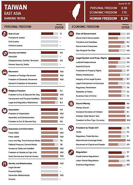 報告將評分項目分為「個人自由」與「經濟自由」,並在兩大指標中細分數十個項目進行評分。台灣在個人自由分數為8.98,排行第20;經濟自由分數為7.70,排行第21,均比去年優異,也讓台灣在2016年自由指數創下10年來新低的26名後,一次躍進8名,在全球159個國家地區中排名第18。