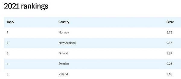 其它值得關注的部分,排行前十名的地區分別為:1.瑞士、2.香港、3.紐西蘭、4.愛爾蘭、5.澳洲、6.芬蘭、7.挪威、8.丹麥、9.荷蘭、英國。