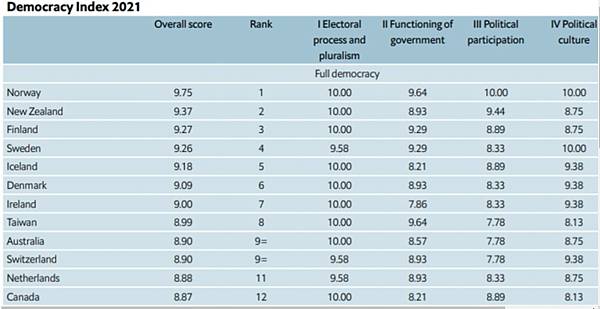 EIU是英國《經濟學人》(The Economist)雜誌旗下研究機構發布「2023民主指數:衝突年代」(Democracy Index 2023: Age of Conflict)報告,挪威以「9.81分」連續第14年位居「民主指數」榜首,排名第2至10名的國家依序是紐西蘭(9.61)、冰島(9.45)、瑞典(9.39)、芬蘭(9.30)、丹麥(9.28)、愛爾蘭(9.19)、瑞士(9.14)、荷蘭(9.00)、台灣(8.92)。