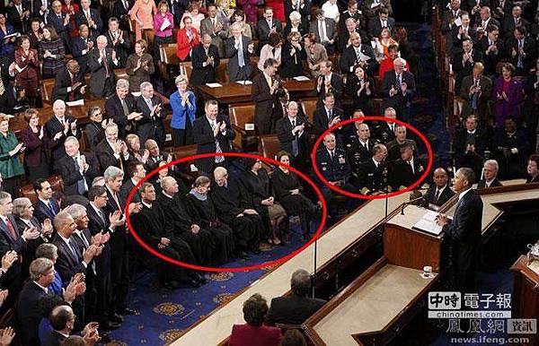 按照美國慣例,大法官們不會為任何內容鼓掌,因為他們代表的是國家權力的另一端──司法公正;另外一群人則是美國參謀長聯席會議成員,在美國,軍人除了軍隊事務才會有所反應,除此之外的事情,一律不鼓掌,因為軍人不能干政。