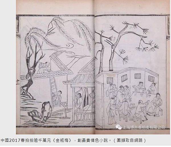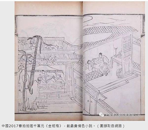 綜合媒體報導,《金瓶梅》是中國文學史上第一部文人創作的長篇白話小說,明朝風氣開放,《金瓶梅》得以印刷發行,但清朝大興文字獄,其後的版本都沒有收錄圖片,這次拍出的版本,是明崇禎本,在清代以木活字排印本;拍出如此高價的原因,主要來自它約百幅描述細膩的情色插圖,保存完好。
