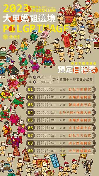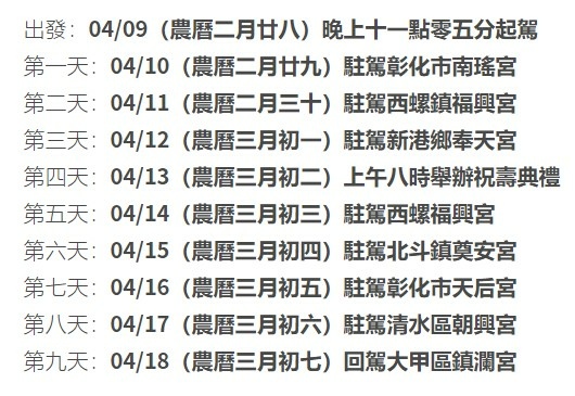 大甲媽祖每年遶境進香時間不定,鎮瀾宮在元宵節當天擲筊決定,今年遶境將在4月17日晚間11時起駕,沿途駐駕彰化南瑤宮、雲林西螺鎮福興宮、嘉義新港鄉奉天宮、雲林北斗鎮奠安宮、彰化天后宮、中市清水區朝興宮,並在26日回駕鎮瀾宮,全程9天8夜。