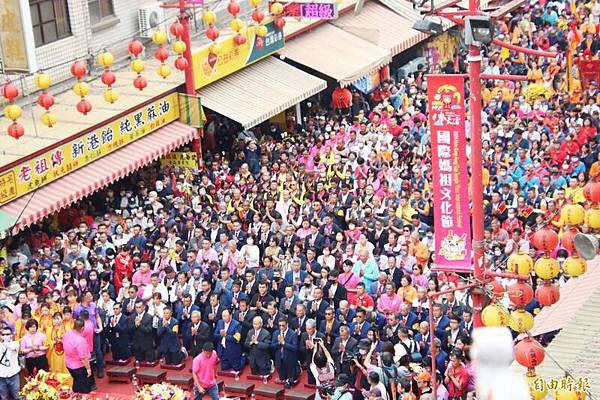 台中大甲鎮瀾宮媽祖到嘉義新港奉天宮遶境進香,今天(9日)上午舉辦祝壽大典,奉天宮周邊擠滿虔誠參與祝壽大典的信眾。(記者林宜樟攝)