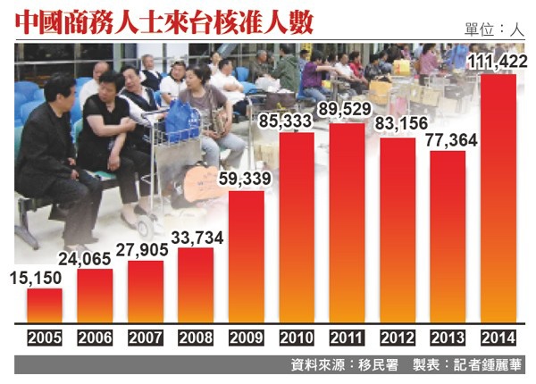 根據移民署統計,二○○五年時中國商務人士來台僅一.五萬人、二○○八年增為近三.四萬人,前年為七.七萬人,但去年為十一萬一四二二人。