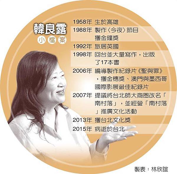 韓良露涉獵博雜,她做過電視編劇、節目製作人,還拿過金鐘獎,她旅居歐洲八年後回台,投入發揚台灣巷弄美學的「南村落」組織,以數百場街巷漫遊的活動,開啟「青康龍」街區在地文化串連,貢獻不少。