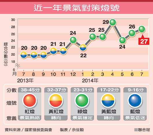 7月景氣對策信號綜合判斷分數為15分,較上月增加2分,9項構成項目中,股價指數由綠燈轉呈黃紅燈,貨幣總計數M1B由藍燈轉呈黃藍燈,分數各增加1分;其餘7項燈號不變。