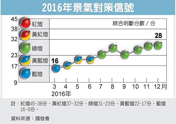 國發會昨(26)日公布2016年12月景氣燈號續呈綠燈,創下連六綠,綜合判斷分數更來到28分,為2014年9月以來的高點。國發會經濟發展處處長吳明蕙表示,景氣處在穩定復甦的軌道上,尤其投資、出口表現值得期待。