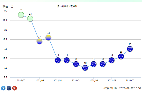 2015年1至11月已經亮出七顆藍燈,下半年起更是連六藍,第3季綜合判斷分數落至低點14分,10月、11月微升至15分。