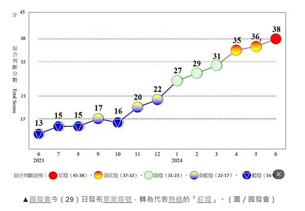 國發會表示,整體而言,國內經濟可望逐漸脫離低緩、逐季好轉,但全球貨幣政策動向及地緣政治情勢發展,仍須密切留意。 國發會-景氣指標查詢系統-景氣對策信號