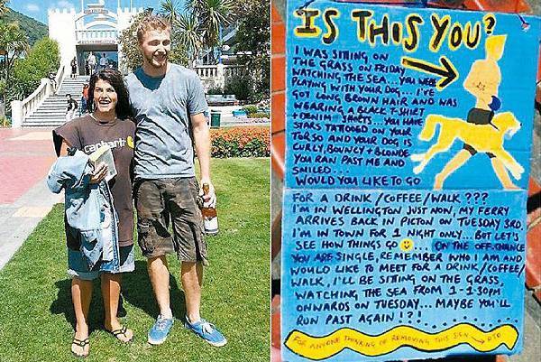 這場邂逅發生在紐西蘭的濱海小鎮Picton,2月底,碼頭旁出現一塊紙板,上面寫著「是你嗎?上周五我坐在草地上看海,你牽著狗跑過去,對我笑了一下,我是棕色長髮、穿黑T恤和短褲,想問你願意一起去喝杯咖啡或散步嗎…如果你是單身,對我有印象,周二下午我還會搭渡輪過來,也許你會從我身邊經過?」