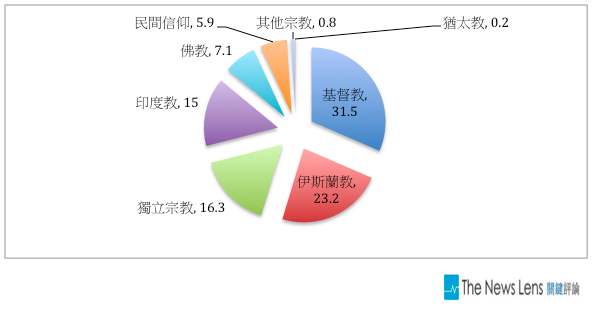 在全球人口比例上,以基督教的31.5%最高,伊斯蘭教以23.2%緊接在後。印度教占15%,佛教則有7.1%。
