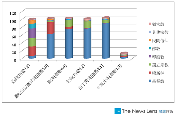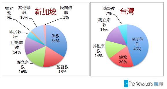 至於位居第二的台灣,最大的宗教族群是民間信仰,比例高達45%,佛教則以超過20%的比例緊接在後,獨立宗教和其他宗教的比例在13%-15%之間,基督教則大約占7%。