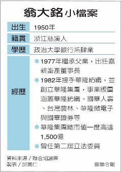 分享昨天過世的前華隆集團掌門人翁大銘,早年為奪回家族事業,曾上演「王子復仇記」,事業版圖橫跨紡織、人壽與證券業,市值高達一千五百億元。但他卻也因華隆案、洪福證券違約交割案等官司纏身,一生大起大落。