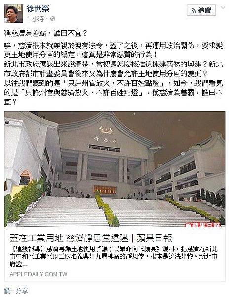 對於慈濟財務的爭議,潘建志今(18)天在臉書上PO文表示,「慈濟爭議,我最早提出要通過理想的『宗教團體法』。但後續討論不多,立法院也沒動作。除了財務和用地法規要嚴格合乎民眾期待外,更重要是『宗教法人』和『宗教基金會』的管理辦法,董監事要改選輪替,不能被私人家族掌控,要有統一的主管機關」。