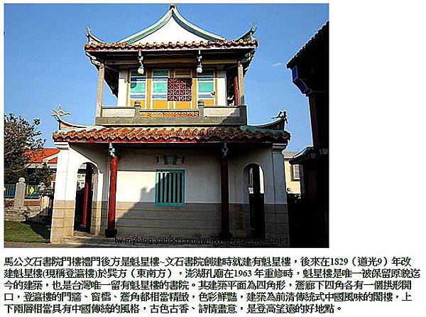 光緒元年(1875)乙亥施槃任文石書院山長時,於秋八月上旬刊刻〈登瀛樓落成記〉一文(《澎湖廳志》內有詳文),敘明澎湖文武各界人士對此西瀛一大壯觀,洵足為士人登瀛之象徵的登瀛樓(魁星樓)能樹先正之典型,作中六之砥柱。今因文石書院(孔廟)數次的重修,兩位與考試相關的神明文昌帝君、魁星合祀在魁星樓內。北向立面處有「澎湖文石書院魁星樓」碑,由澎湖縣政府於民國68年(1979)六月修建時立碑於此;由碑上所文可得知文石書院魁星樓之歷史脈絡與變遷。 文石書院(澎湖孔廟)-澎湖縣馬公市-旅遊景點-(VR 實景旅遊網)