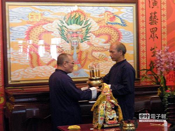 台灣豫劇團長彭宏志(右)為祖師爺田都元帥安座。(李義攝)