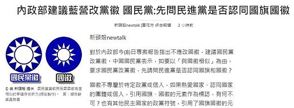 對於內政部今(8)日專案報告指出不應改國徽,建議國民黨改黨徽。中國國民黨表示,如要以「與國徽相似」為由,要求國民黨改黨徽,先請問民進黨是否認同國旗和國徽?內政部建議藍營改黨徽 國民黨:先問民進黨是否認同國旗國徽 https://bit.ly/3t5rQgD