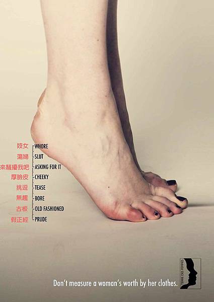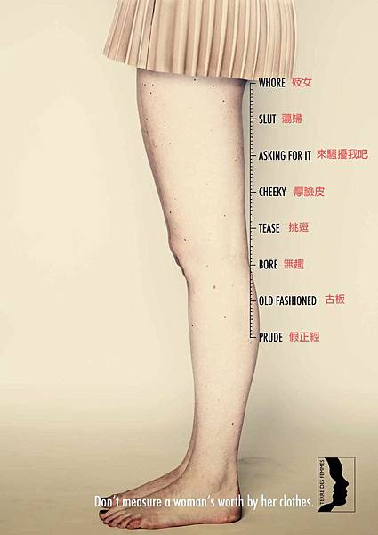 這項系列廣告名為「不要以穿著來衡量一名女性的價值」(Don’t measure a woman’s worth by her clothes),量尺分為「妓女、淫蕩、騷擾我吧、厚臉皮、挑逗、無聊、古板、放不開」等,指出女性的鞋跟越高、裙長越短,往往也會被投以不雅的形容詞,但穿著保守,仍會被形容成保守、無聊等不公平評論。