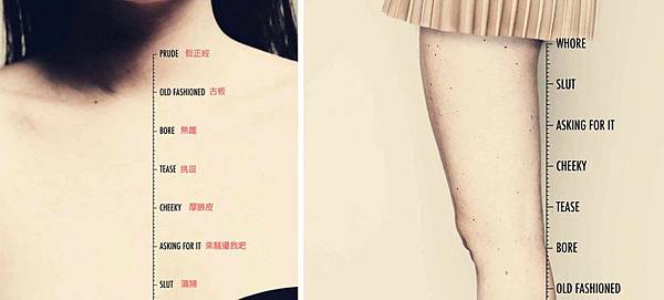 可以看見,當穿著長度過膝的裙子時,你會被人稱作是「假正經」、「古板」的,然而當你試圖擺脫這樣的標籤時,卻又換來「無恥」、「淫蕩」的稱謂,無論怎麼做都不對。