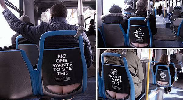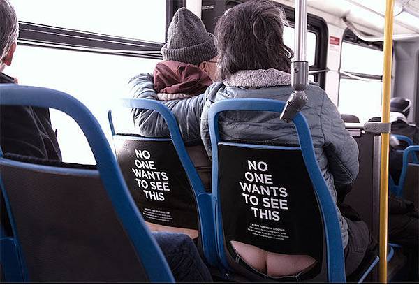 原來這個尷尬的畫面並不是實際發生的狀況,而是公車上的椅背廣告!這個創意發想是來自Meredith’s Miracles基金會和FCB廣告製作團隊的合作,他們利用有點尷尬卻超級顯眼的股溝照片來吸引大家的注意,並在上頭標註大大的標語「NO ONE WANTS TO SEE THIS , EXCEPT FOR YOUR DOCTOR 沒有人想看這個,除了你的醫師之外」。