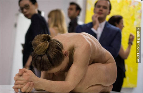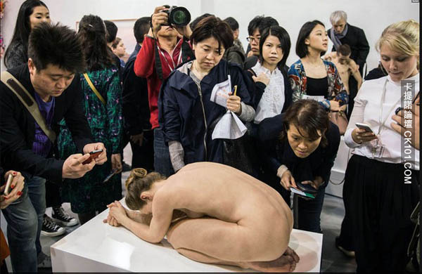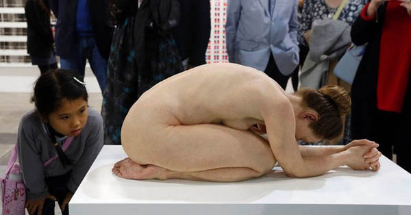 英國《鏡報》報導,展中可見一名跪地裸女吸引眾人目光,無論大人小孩皆駐足仔細觀看,還有民眾更按下快門猛拍。其實裸女並非真人,是澳洲藝術家金克斯(Sam Jinks)一手打造,從皮膚到肌肉紋理無一不像真人,而金克斯為求逼真,更採用人髮與合成材料製作,果然成功吸引觀展民眾目光。