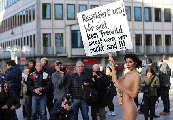 分享瑞士表演藝術家莫爾(Milo Moire)今天在科隆(Cologne)的大教堂前脫光衣服,以抗議歸咎於移民的性侵行為。