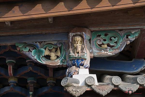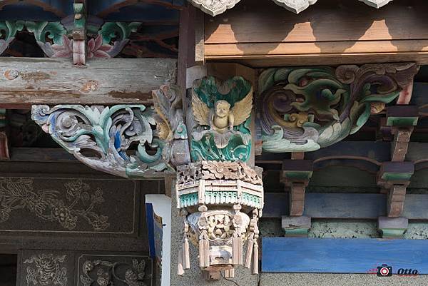 ▲▼明間龍、虎爿兩側龍柱上方出簷,並有花籃吊筒及人物豎材,兩側為托木,托住「挑簷桁」。另,「壽樑」下龍柱柱頭一側為托木,另向中央伸出連托,再接一個吊筒,再接托木。托木有許多的人物題材雕刻。