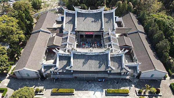 ▲被一大片稻穗與綠茵濃密的樹叢團團包圍的張廖宗祠。整體平面呈現圓形的格局,配合建築形制呈現外圓內方之樣貌。