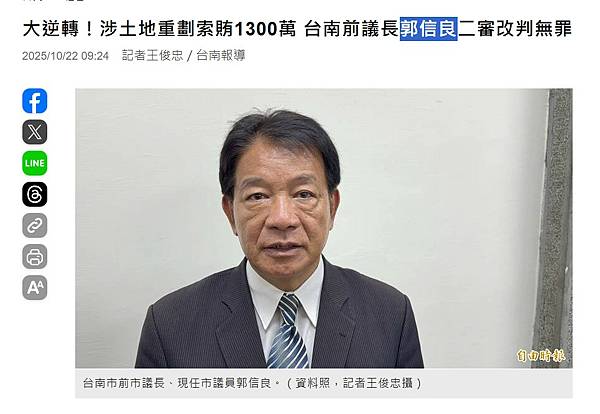 大逆轉!涉土地重劃索賄1300萬 台南前議長郭信良二審改判無罪 - 社會 - 自由時報電子報