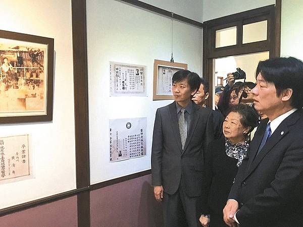 黃清舞列為台南市政治類歷史名人,市府昨天舉行故居紀念牌掛牌儀式,市長賴清德(右一)與黃清舞的二媳婦黃林守真(右二)參觀老照片。 記者吳政修/攝影