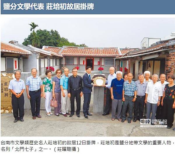 台南市歷史名人莊培初位於佳里區的故居12日掛牌,他是台南鹽分文學作家群中重要的詩人代表,與吳新榮齊名,是當時的「北門七子」之一,日據時期還曾擔任過記者,兼有小說及評論作品,他的故居是南市第20處掛牌的名人故居,也是佳里區繼吳新榮後,第2位掛牌的文學類歷史名人。