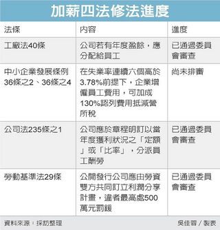 朝野立委推動「加薪四法」,繼日前勞動基準法修正草案通過初審,立院經濟委員會昨也初審通過公司法及工廠法修正草案。「加薪四法」已過三法,但因工商團體反彈,法案會不會明過暗擋?內容會不會中看不中用?都是問題。