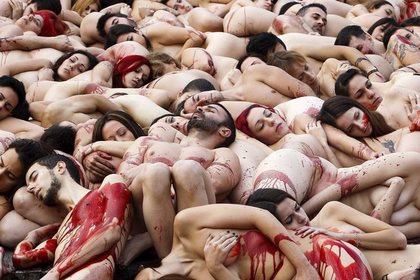 近百名動保人士今天聚集在西班牙巴塞隆納,頂著14度低溫脫去全身衣物躺在地上,並灑上紅色顏料,抗議人類為了一己之私,犧牲一隻隻動物,將牠們用以保暖的毛皮作成皮草大衣或配件。(余浚安/綜合外電報導)