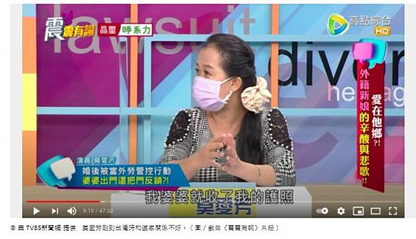 莫愛芳在節目《震震有詞》中坦言,自己在嫁來台灣的第一天就感到後悔,她透露剛到台灣時,婆家就沒收了她的護照,限制她打越洋電話回娘家,婆婆還在老公出門工作後以「保護」為由將莫愛芳反鎖家中,這讓孤身一人來到台灣的她相當受傷,直言「我是媳婦,不是你們請來的外勞」;她也透露自己有一段時間聽到「台灣最美的人是風景」這句話都很不舒服,覺得根本就是假象。